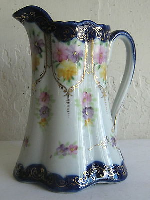 Antique French Porcelain Cobalt Blue Hand Painted Flowers Gilt PItcher Vase