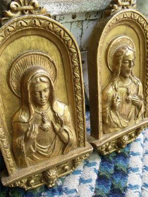 Title (ebay affiliate link): Beautiful Old Vintage Religious Wall Hanging Pieces Christ & Madonna Shabby Gold