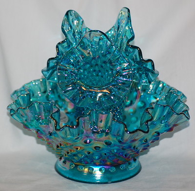 Rare Fenton Art Glass Blue/Green Opalescent Hobnail Epergne