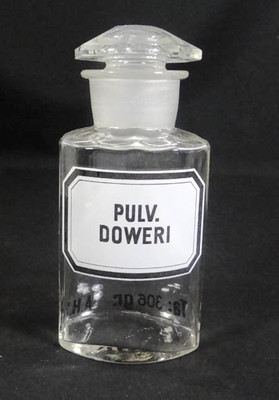 19c.APOTHECARY PHARMACY MEDICAL DRUGSTORE GLASS BOTTLE JAR STOPPER POWDER DOWERI