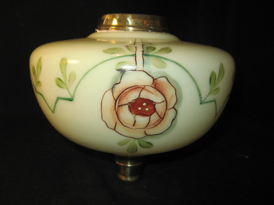 VICTORIAN LIGHT GREEN OPALINE GLASS DECORATED FOUNT FOR AN OIL LAMP
