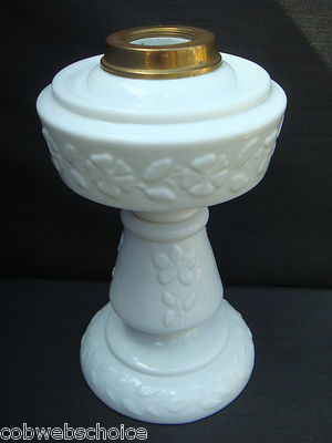 Title (ebay affiliate link): VICTORIAN MILK GLASS OPAQUE GLASS OIL LAMP BASE AND FONT EMBOSSED WITH FLOWERS