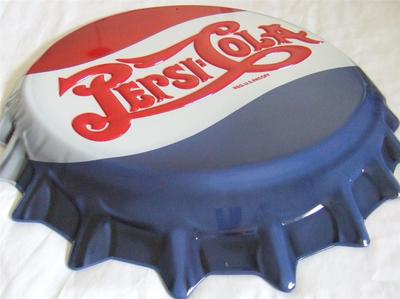 Title (ebay affiliate link): Pepsi Cola Die Cut HUGE Bottle Cap Shape Retro 3-D Tin Sign Home Wall Decor 18"