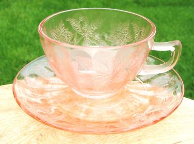 Title (ebay affiliate link): Pink Depression Glass Floral Poinsettia Cup & Saucer