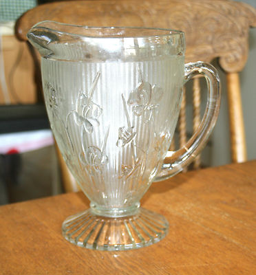 Title (ebay affiliate link): Crystal 9.5" Iris & Herringbone Water Pitcher. Jeanette Co. Depression