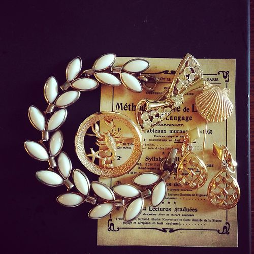 Title (ebay affiliate link): lot 5 vintage Trifari Bracelet Earrings Brooch Milk Glass Bow Wear Or Repair
