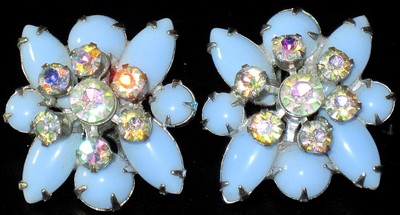 Title (ebay affiliate link): JULIANA Blue Milk Glass & AB Rhinestone Vintage Clip Earrings