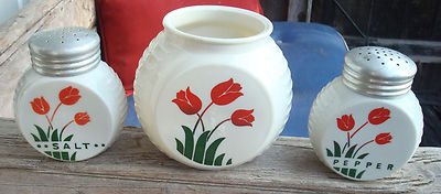 Title (ebay affiliate link): Vintage Art Deco Milk Glass Grease Jar Salt & Pepper Shaker Range Set TULIPS
