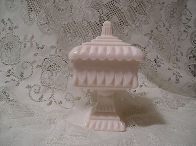 Title (ebay affiliate link): Pink Milk Glass Pedestal Dish & Lid. Jeannette 6 1/2" x 4 " x 1 1/2" Excellent