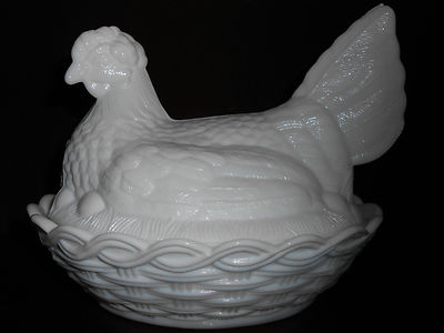 Title (ebay affiliate link): White Milk glass hen chicken on nest basket candy butter dish rooster opaque art