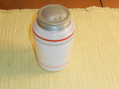 MILK GLASS DEPRESSION GLASS PEPPER SHAKER WITH RED & BLACK STRIPE/ ALUMINUM LID