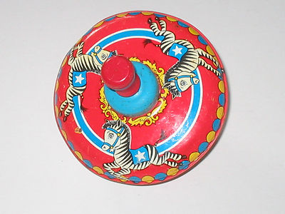 Title (ebay affiliate link): Vintage 1950s Carnival Zebra Ohio Art Tin Toy Spinning Top Wood Handle Litho