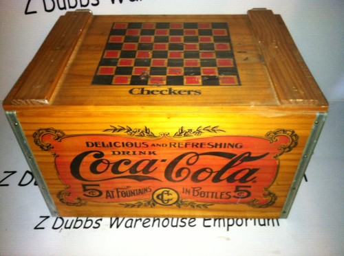 VINTAGE STYLE COCA COLA WOODEN CRATE STORAGE BOX w CHECKERS GAME LID & CHECKERS