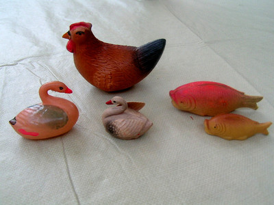 Celluloid Toys, Swans, Chicken, Fish, Carp, Total of 5 animals