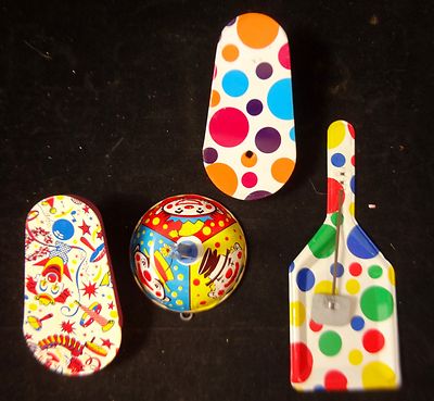 Lot of (4) Vintage " CLOWNS Circus " Tin NOISE MAKERS Toys All Work GREAT COND !