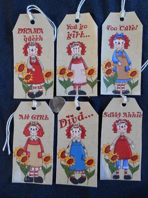 Title (ebay affiliate link): RAGGEDY ANN primitive tags ANNIE gift tags SCRAPBOOK rag doll MAKE-DO primitive