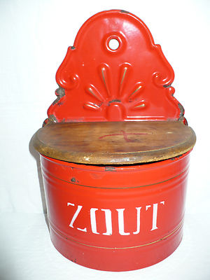 Title (ebay affiliate link): Vintage Red & White Enamel Hanging Salt/Zout Box Enamelware Wood Top Porcelain