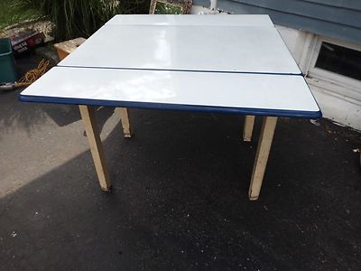 Title (ebay affiliate link): VINTAGE Enamel Top Table white Blue 41"X 46" Metal Art Deco Drawer Leaves Wood