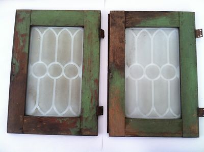 2 Vintage Antique Hoosier Cabinet Oak Framed Etched Glass Doors