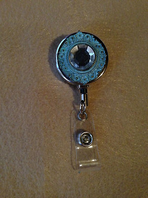 Title (ebay affiliate link): Turquoise Vintage Style Jewel Metal Badge Reel ID Name Tag Key Chain Holder