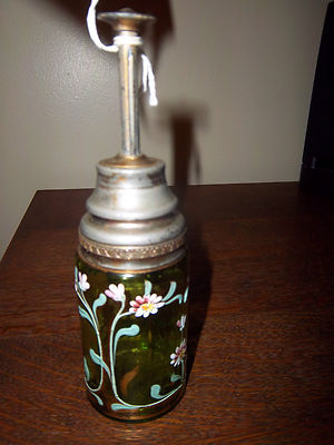PERFUME ATOMIZER ANTIQUE GREEN GLASS GOLD TRIM FLORAL PINK FLOWERS COLLECTIBLE**