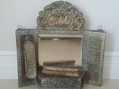 Title (ebay affiliate link): Dutch Colonial Antique Wallshelf Brass/Copper Beveled Faceted Mirror 2 x Brush