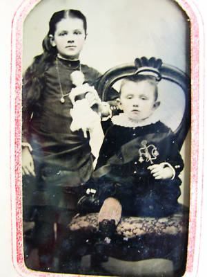 ANTIQUE TINTYPE PHOTO BOY & GIRL WITH CHINA DOLL & TOY