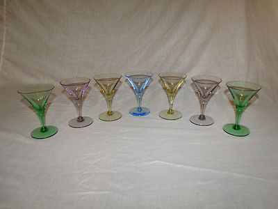 Title (ebay affiliate link): 7 MULTI-COLORED HANDCRAFTED CRYSTAL DEPRESSION GLASS VINTAGE MARTINI GLASSES