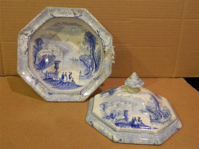 Staffordshire Blue Transfer Covered Casserole 8 Sided Scenic 1848