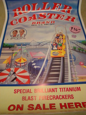Title (ebay affiliate link): VINTAGE CASSEROLA BROS. ROLLER COASTER FIRECRACKER POSTER Titanium Blast Cracker