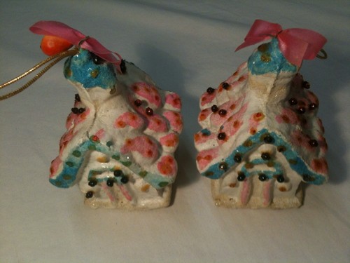 Title (ebay affiliate link): Two Vintage Paper Mache Church House Christmas Ornaments