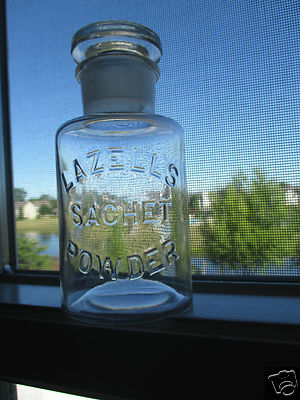 Title (ebay affiliate link): Blown Bottle Boldly Embossed: Lazell's Sachet Powder Ground Glass Stopper Nice!