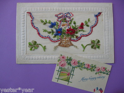 Title (ebay affiliate link): WW1 Silk Postcard ~ MANY HAPPY RETURNS ~ From Tom ~ Basket of Flowers