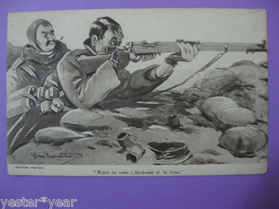 Title (ebay affiliate link): WW1 Postcard ~ BRUCE BAIRNSFATHER ~ WATCH ME MAKE A FIRE BUCKET OF 'IS 'ELMET