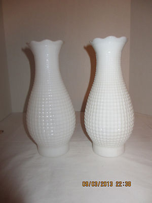 2 VINTAGE WHITE HOBNAIL MILK GLASS OIL HURRICANE LAMP GLOBE SHADE 10" TALL pair