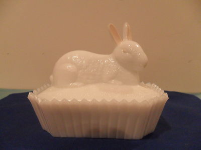 Title (ebay affiliate link): Vintage Westmoreland Rabbit Bunny Trinket Box White Milk Glass Picket Base