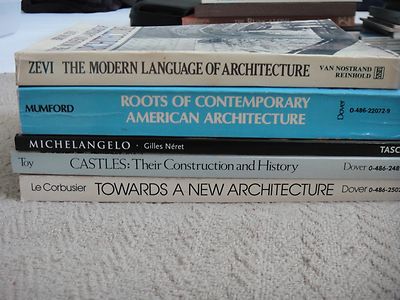 Title (ebay affiliate link): 5 VTG ARCHITECT DESIGN BOOKS - ZEVI, MUMFORD, CORBUSIER, TOY, NERET - PAPERBACKS