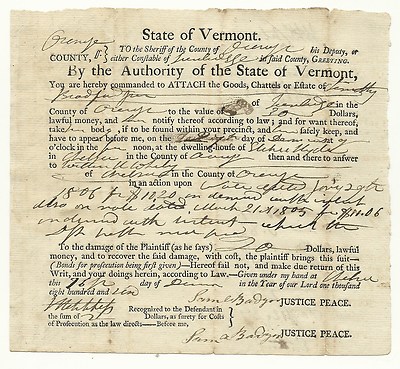 1806 State of Vermont SHERIFF'S ARREST WARRANT 1806