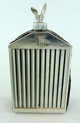 Title (ebay affiliate link): Vintage Rolls Royce Grill Decanter Bottle Flask Glass Leather Metal 8 In Tall