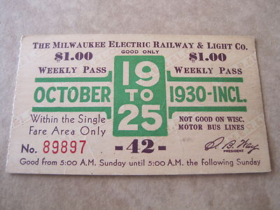 Title (ebay affiliate link): 1930 MILWAUKEE ELECTRIC RWY & LIGHT CO OCTOBER 19 TO 25 WEEKLY PASS
