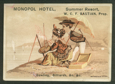 Monopol Hotel Summer Resort Bowling Billiards trade card 1880s WCF Bastian prop