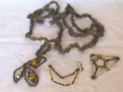 Vintage Xmas Antique Tinsel Garland Silver / Gold 4 ft & Bead Tinsel Ornaments