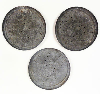 3 ANTIQUE GALVANIZED PERFORATED FOLK ART PRIMITIVE PIE TINS ORIGINAL SURFACE