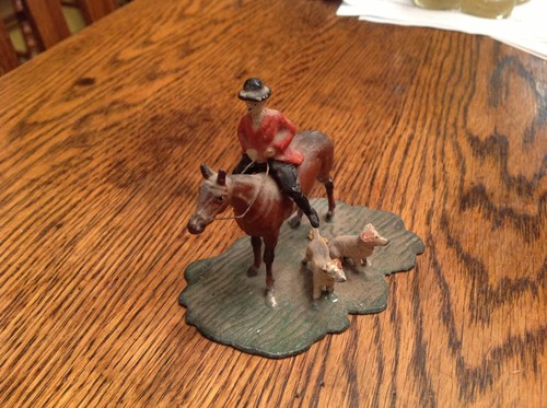 Title (ebay affiliate link): ANTIQUE MINIATURE HORSE RIDER FOX HUNT SIGNED GERMANY METAL OLD GERMAN