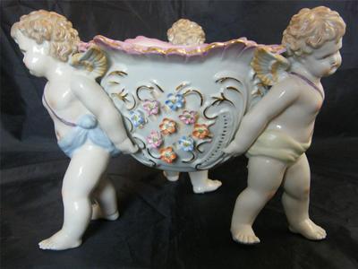 HAND PAINTED PORCELAIN CHERUB COMPOTE WITH APPLIED FLOWERS