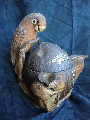 | Antique Art Deco Handmade Carved Budgerigar On the Coconut Bowl |
