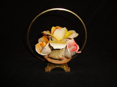 Title (ebay affiliate link): CAPODIMONTE F.A.B. Porcelain Rose Flowers in Brass Basket 5" Tall
