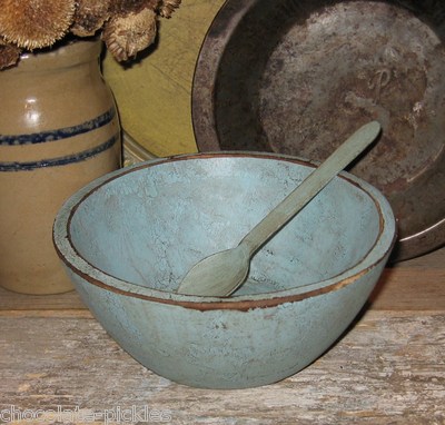 Title (ebay affiliate link): Child Size Wood Dough BOWL*Farmhouse BLUE Crackle+SPOON*Primitive Country Decor