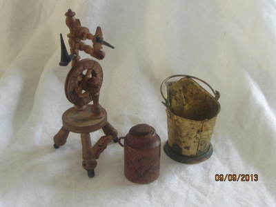 Title (ebay affiliate link): 3 MINI DOLLHOUSE SALESMAN SAMPLE MOONSHINE JUG, COAL HOD & MINI FLAX WHEEL. NR