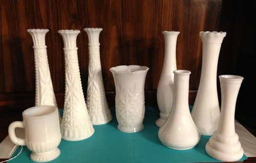 Title (ebay affiliate link): Lot of 9 WHITE MILK GLASS BUD VASES Different styles and sizes Wedding LOT